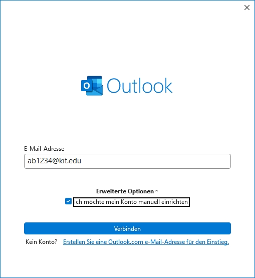 (Studierende: <uxxxx>∂student.kit.edu; Gäste und Partner: <ab1234>∂partner.kit.edu) - Erweiterte Optionen - Ich möchte mein Konto manuell einrichten: Ja