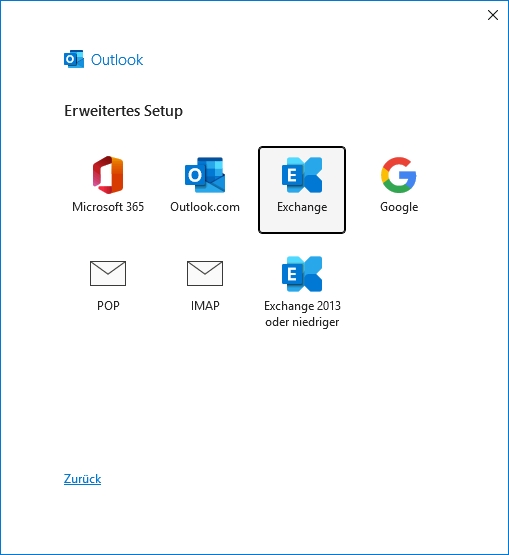 ⚠ Beim Hinzufügen eines Kontos in der Profilverwaltung, wird der alte Kontoassistent verwendet, s. Outlook 2016.