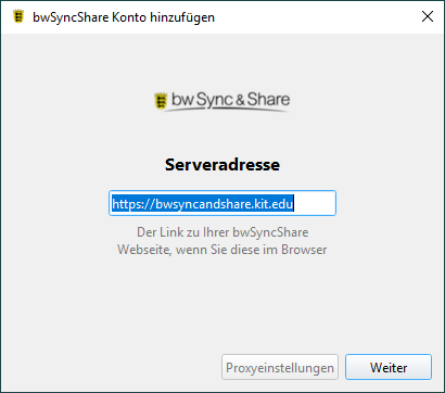 - Server-URL bestätigen: Die Server-URL https://bwsyncandshare.kit.edu ist bereits voreingestellt. Klicken Sie auf "Weiter".