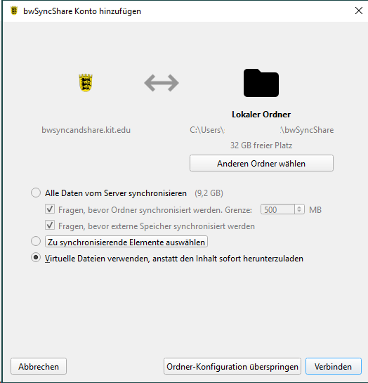 Um den bwSync&Share-Client für die Synchronisation einzurichten, gehen Sie wie folgt vor: