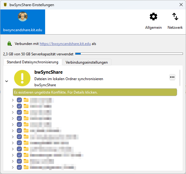 - Synchronisationsoptionen festlegen: Wählen Sie in den Einstellungen, welche Ordner aus Ihrem bwSync&Share-Konto mit Ihrem lokalen Gerät synchronisiert werden sollen (z.B. Radio-Button "Alle Daten vom Server synchronisieren" oder nur bestimmte Daten mit Radio-Button „Zu synchronisierende Elemente auswählen).