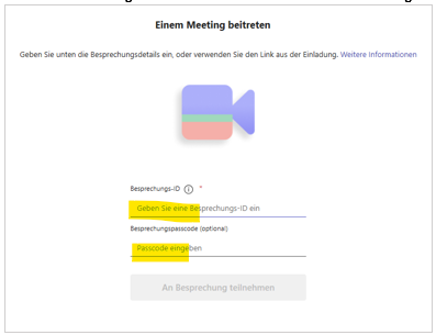 - Um an der Besprechung teilzunehmen bestätigen Sie Meeting-ID und Passcode mit „An Besprechung teilnehmen“