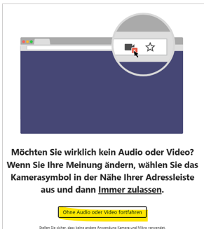 - Sie haben kein Mikro und kein Video und können auch keine Inhalte teilen, bestätigen Sie mit „Ohne Audio oder Video fortfahren“