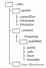 Time Directories | 0, ... | The directory 0 contains the initial conditions at the start time (=0). In the controlDict as time increment deltaT is specified and a writeInterval, so that all deltaT*writeInterval time units, the results are written out into a new directory. |