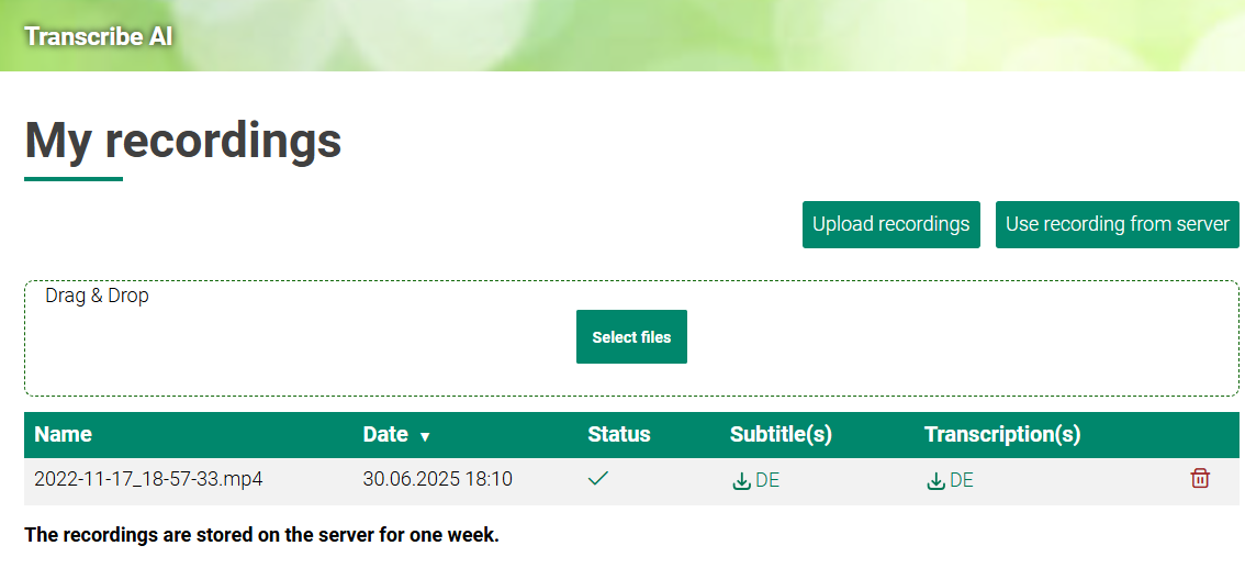 Transcription takes place on the KIT's own hardware. The processing of the uploaded files takes place after incoming orders and can take some time, depending on the current workload.