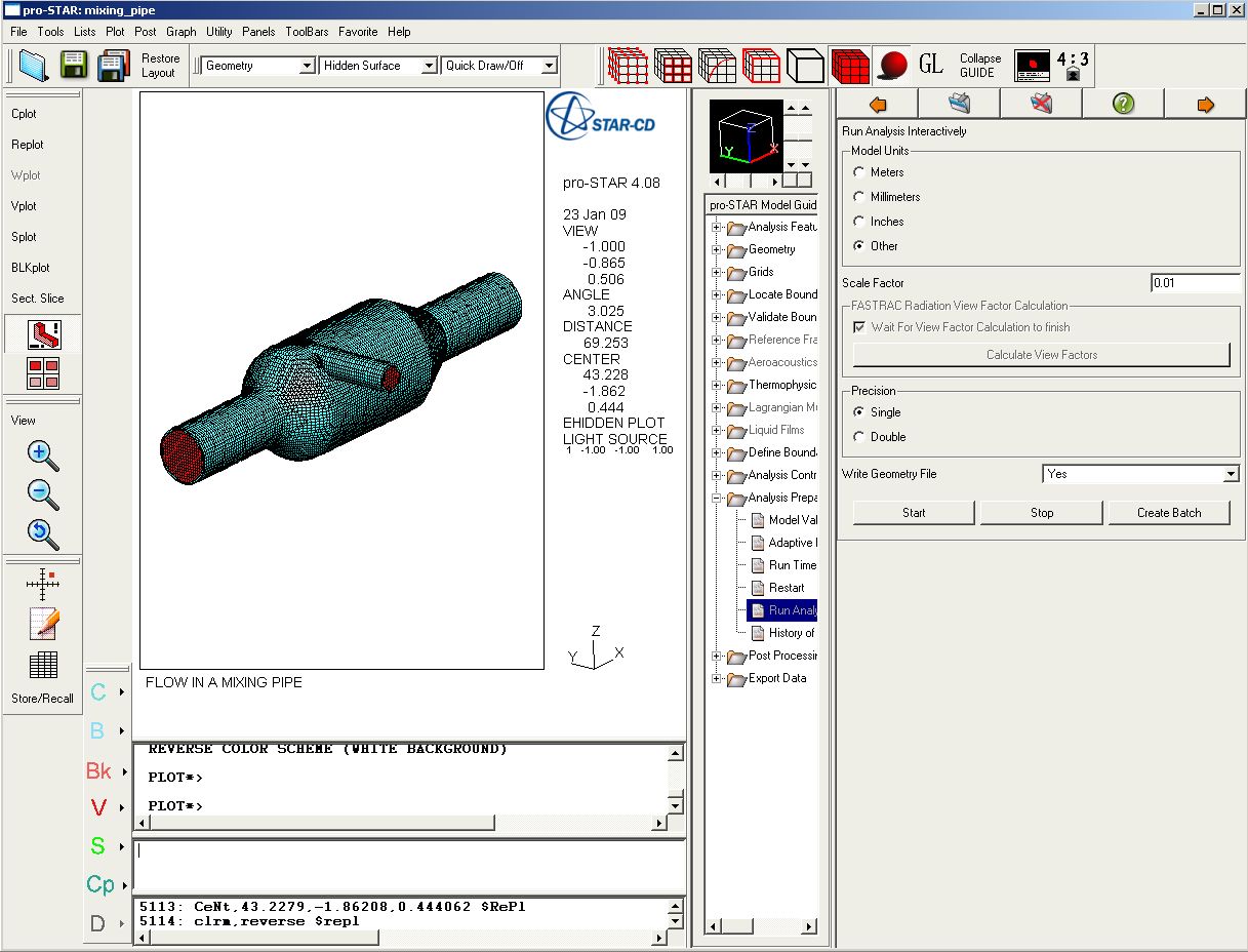 In pro-STAR kann sowohl im Kommando-Modus als auch im grafischen Modus gearbeitet werden. Besonders komfortabel ist ein weiteres grafisches Tool STAR GUIde, mit dem man sich durch die Modellentwicklung über die Berechnung bis zum Postprocessing führen lassen kann und in dem ein großer Teil der pro-STAR Funktionen bequemer ausführbar ist.